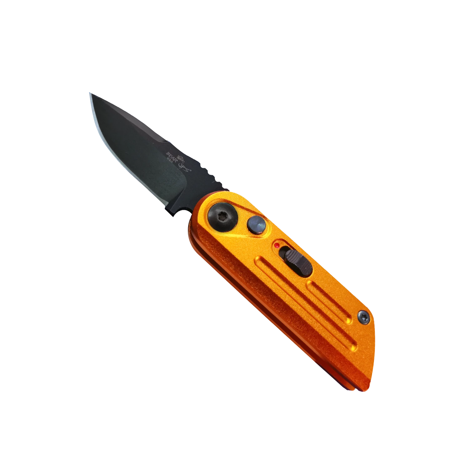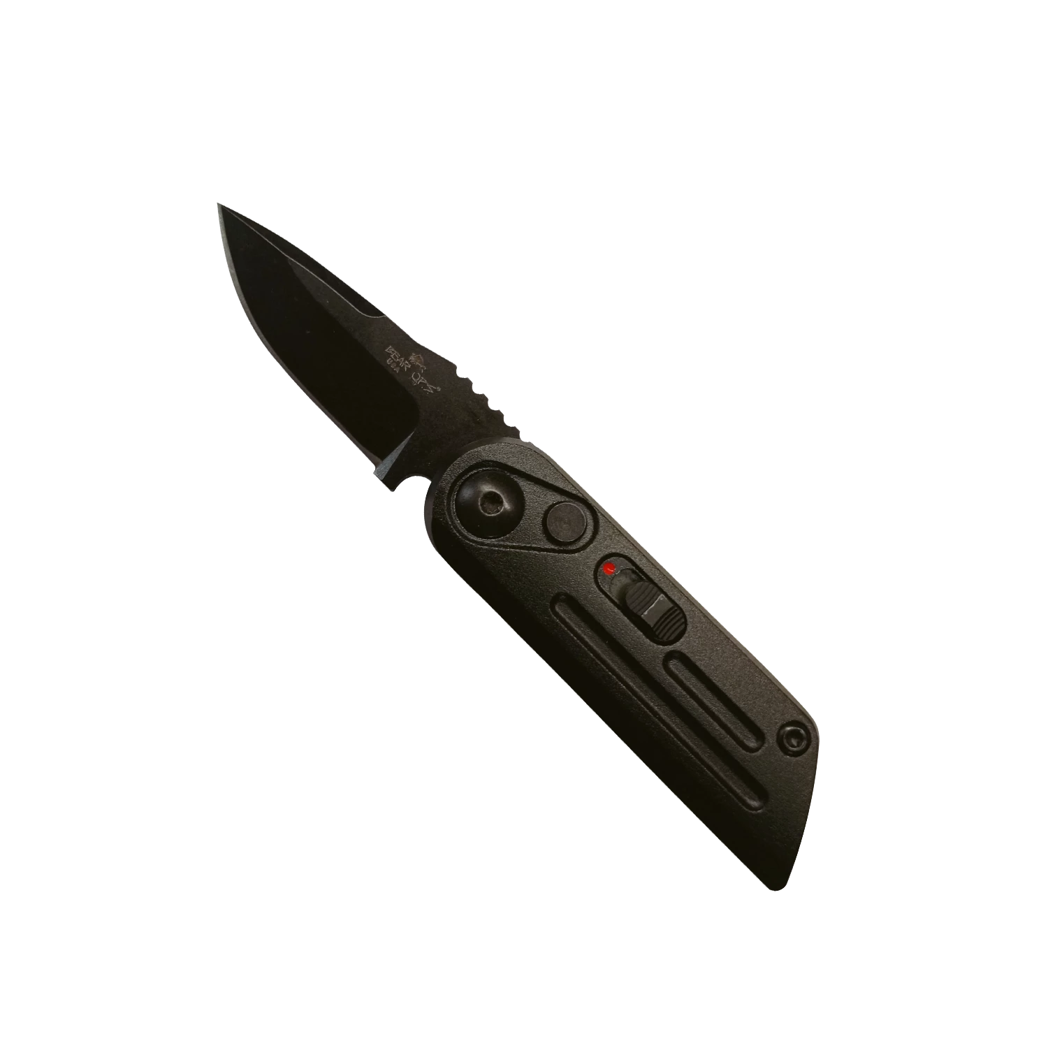 The Bear Ops AC-1400 is part of the Auto Bold Action® XIV series. The Hollow Ground 1-1/2″ blade edge is made with Sandvik 14C28N Premium Steel with a Black Finish allowing for a tough blade with great edge retention. The blade quickly opens with a press of the raised button with a safety lock switch just below. Although it is an automatic, the small blade size makes it legal to carry in the State of California . The Stainless Steel 2-1/2″ handle features a pocket clip for tip up carry. The Bear Ops AC-1400 has an overall length of 4-1/4″ and weighs 1.4 ounces. Bold Action® XIV is proudly made in the USA.