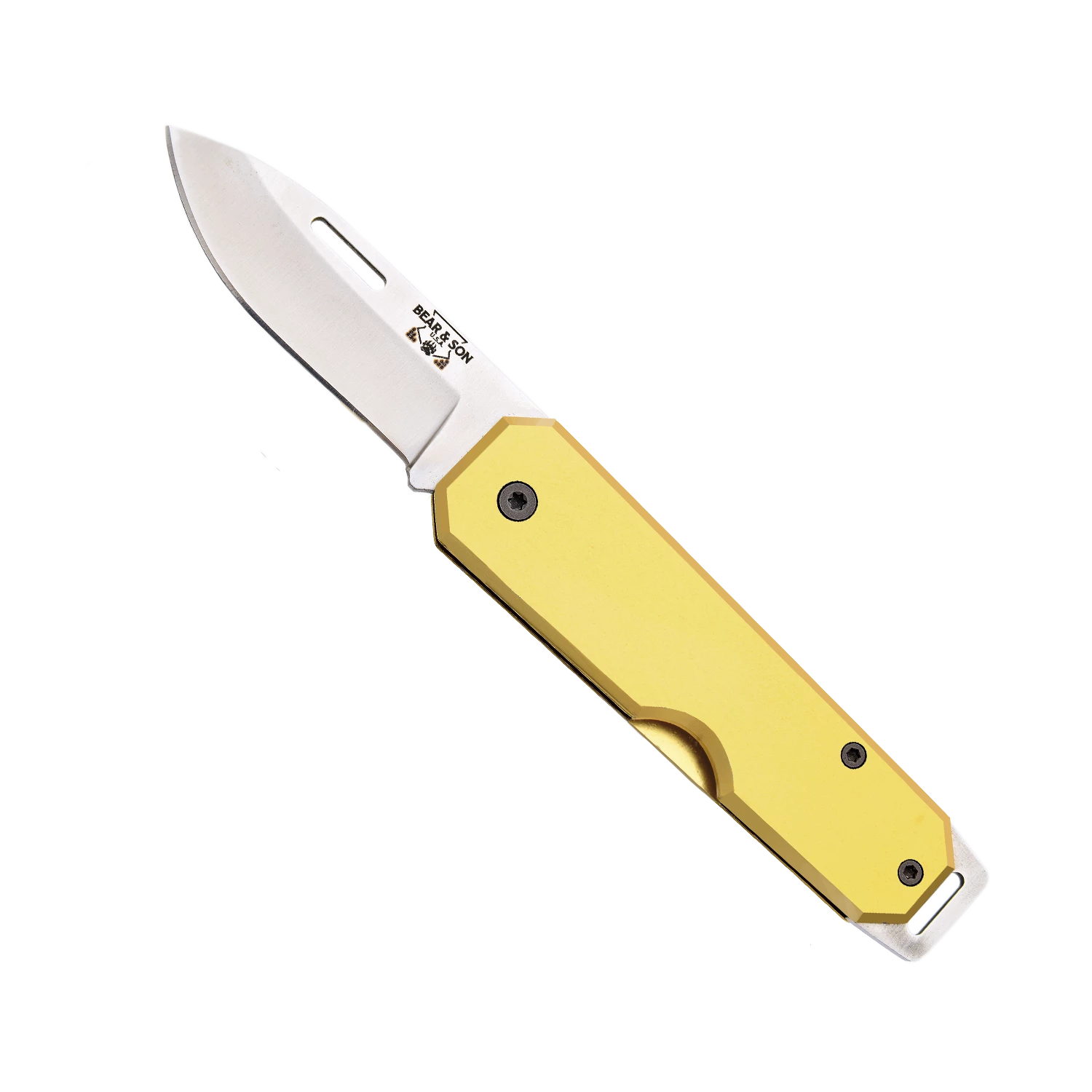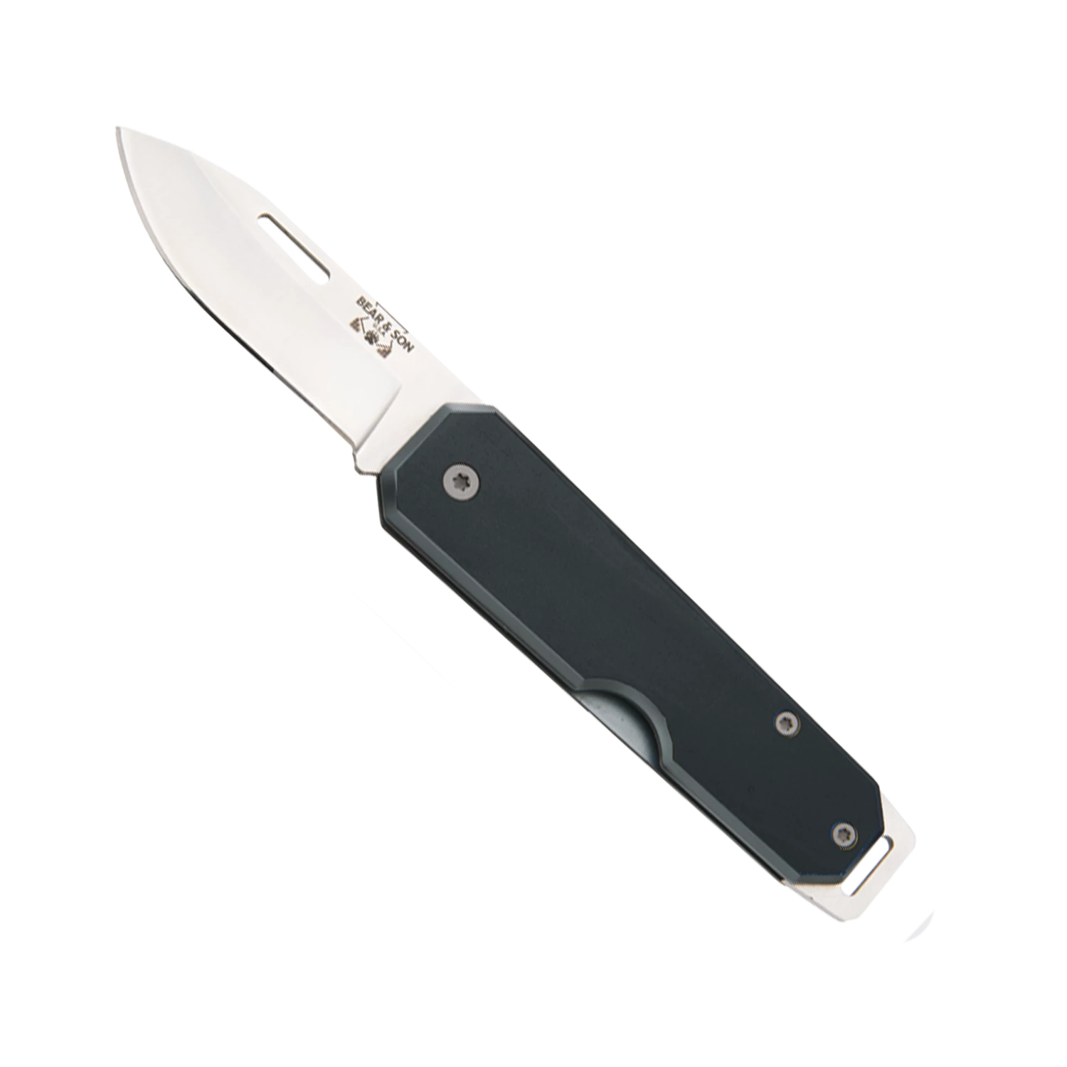 The Bear & Son 110 is a Lightweight Slip Joint Drop Point with an Aluminum Handle. The Taper Ground 2-3/8″ Drop Point Blade is made from High Carbon Stainless Steel, making it rust resistant, easy to sharpen, and will hold an edge exceptionally well. The Bear & Son 110 has a hollow nail nick present to open the blade. The Bear & Son 110 has an overall length of 6-1/2″ and is a good size to fit in the pocket and features a short pocket clip. The 110 weighs 1.9 ounces.
