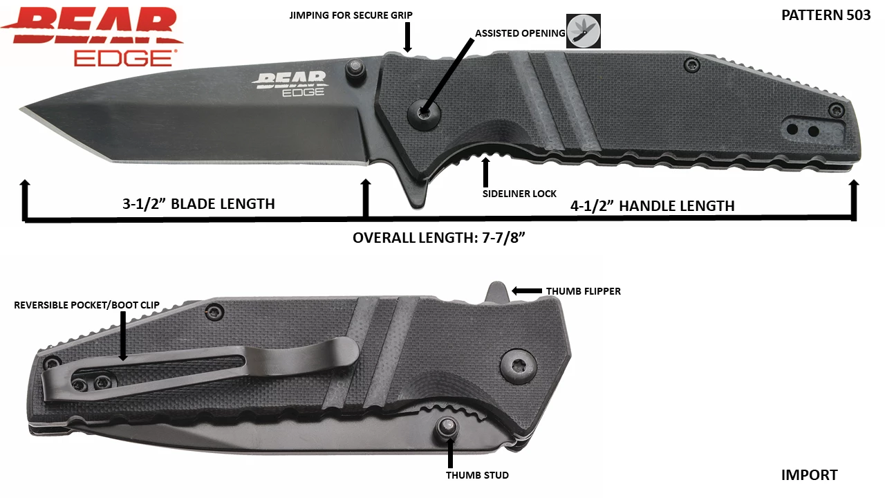 - Extras : Assisted Opening, Sideliner Lock, Black Finish Blade, Reversible Pocket Clip & Taper Ground Blade