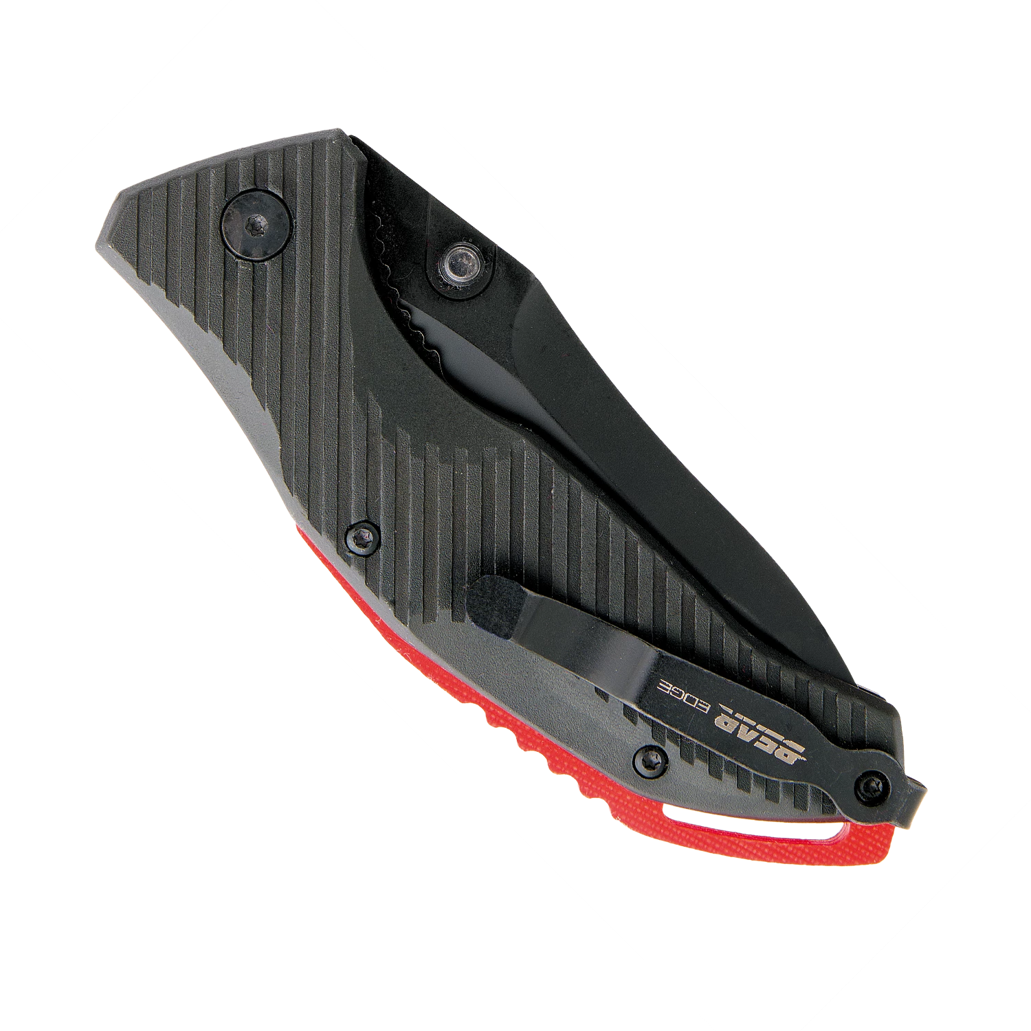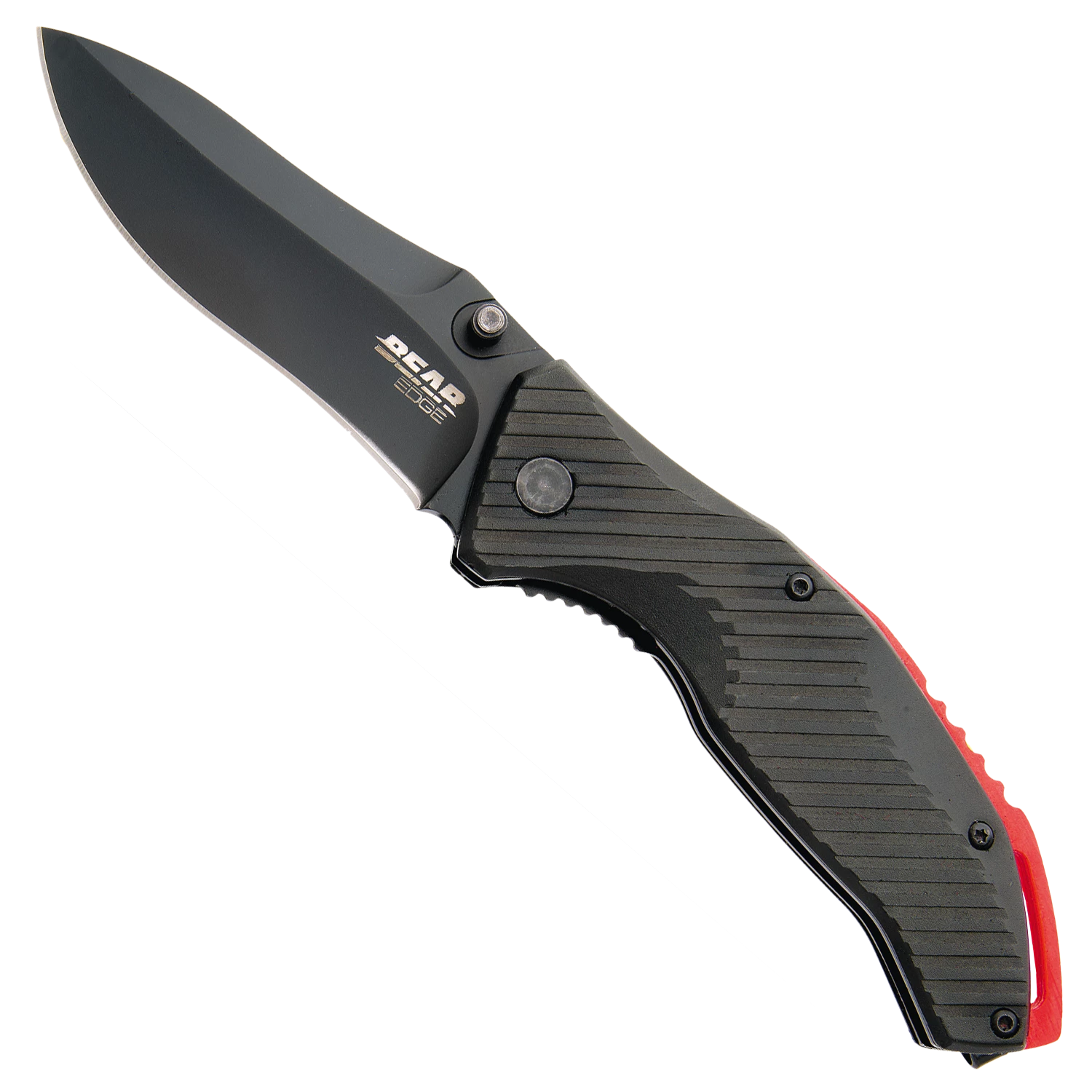 The Bear Edge Pattern 103 is an American built 4-1/2” Black & Red Assisted Sideliner. The hollow ground 3-1/2” blade is made from 440 stainless steel with a black powder coating finish. The spring action and ball bearing washers allow the blade to open rapidly with a simple push up on the dual thumb studs. The 4-1/2” black and red handle has a more rugged style but fits firmly in the hand allowing for a secure grip. Pattern 103 has a stainless-steel sideliner lock to ensure that the blade remains firmly in place and is easy to close. A reversible pocket clip is also present that allows for a tip-up carry and quick access. A slightly longer lanyard spacer is present on the back of the handle that is for secure fastening and storage. The open length for Pattern 103 is 7-3/4” and weighs 4.3 ounces.