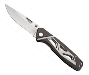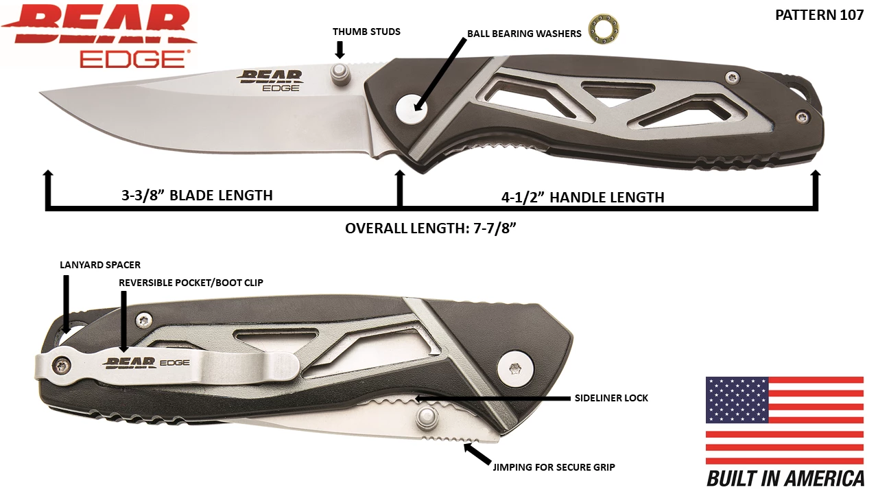 Pattern 107 is a USA built 4-1/2” Black & Silver Aluminum Sideliner that is part of our Bear Edge® line and weighs 3.5 ounces. The 3-3/8” hollow ground modified drop point blade is made with 440 High Carbon Stainless Steel with a bead blast finish to prevent rust and is easy to sharpen. Pattern 107 is designed with thumb studs and smooth action ball bearing washers for an easy and swift opening. The stainless-steel sideliner lock ensures that the blade remains firmly in place and jimping is present on the sideliner lock for a more secure grip. The black and silver aluminum handle features a reversible pocket/boot clip for tip-up carry for either left- or right-hand carry and quick access. A lanyard spacer is present on the back of the handle for secure fastening and storage. Pattern 107 also has the Bear Edge® logo is engraved on the blade and the pocket/boot clip.