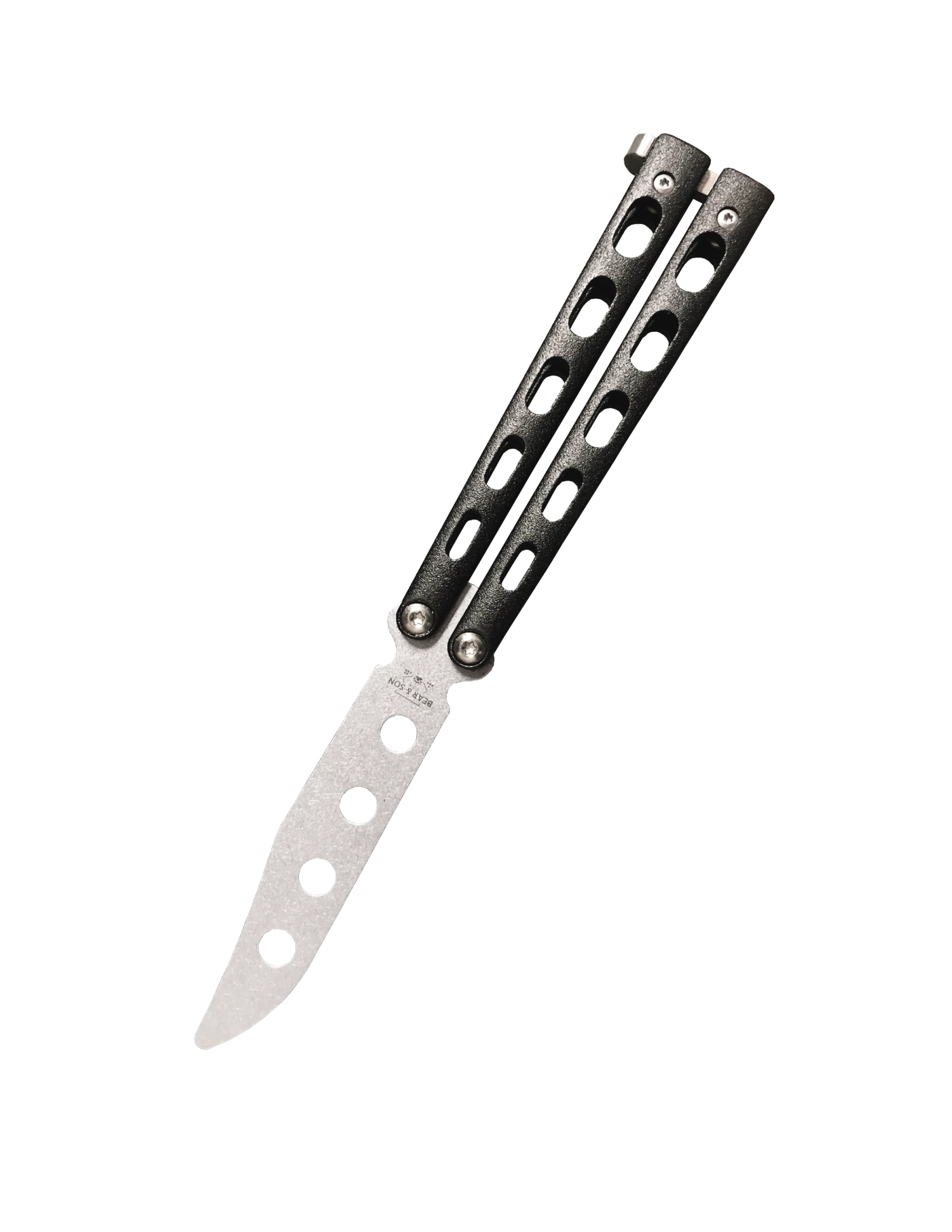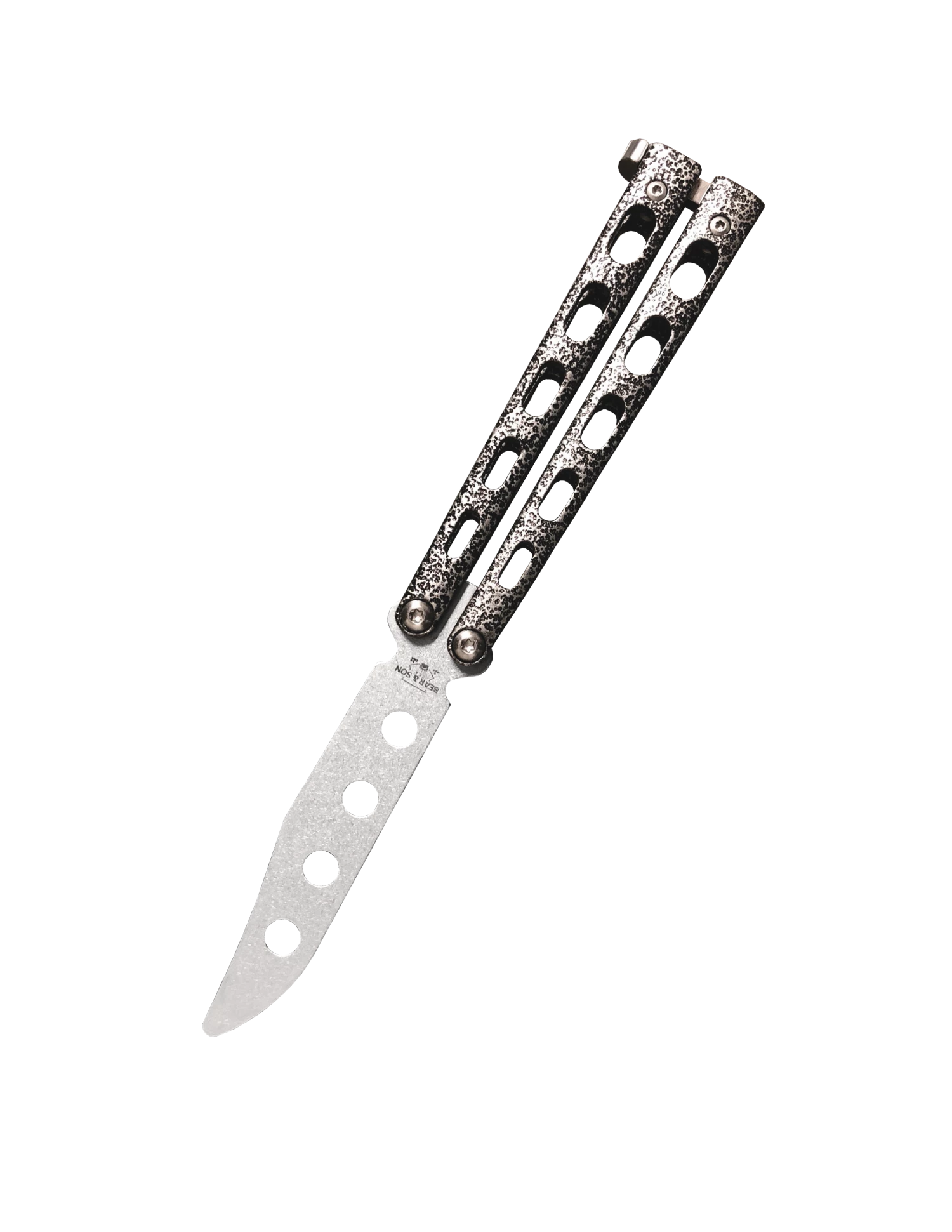 The Bear & Son 113TR is a Silver Vein 4″ Butterfly Trainer that is small and lightweight due to its skeletonized handles. The trainer blade has holes to simulate the feel of a real butterfly knife and is made from High Carbon Stainless Steel. The Bear & Son 113TR has a durable tang pin construction and weighs just 3.8 ounces. The overall length of this small butterfly is 7-1/2″ and features zinc handles with epoxy powder coating.