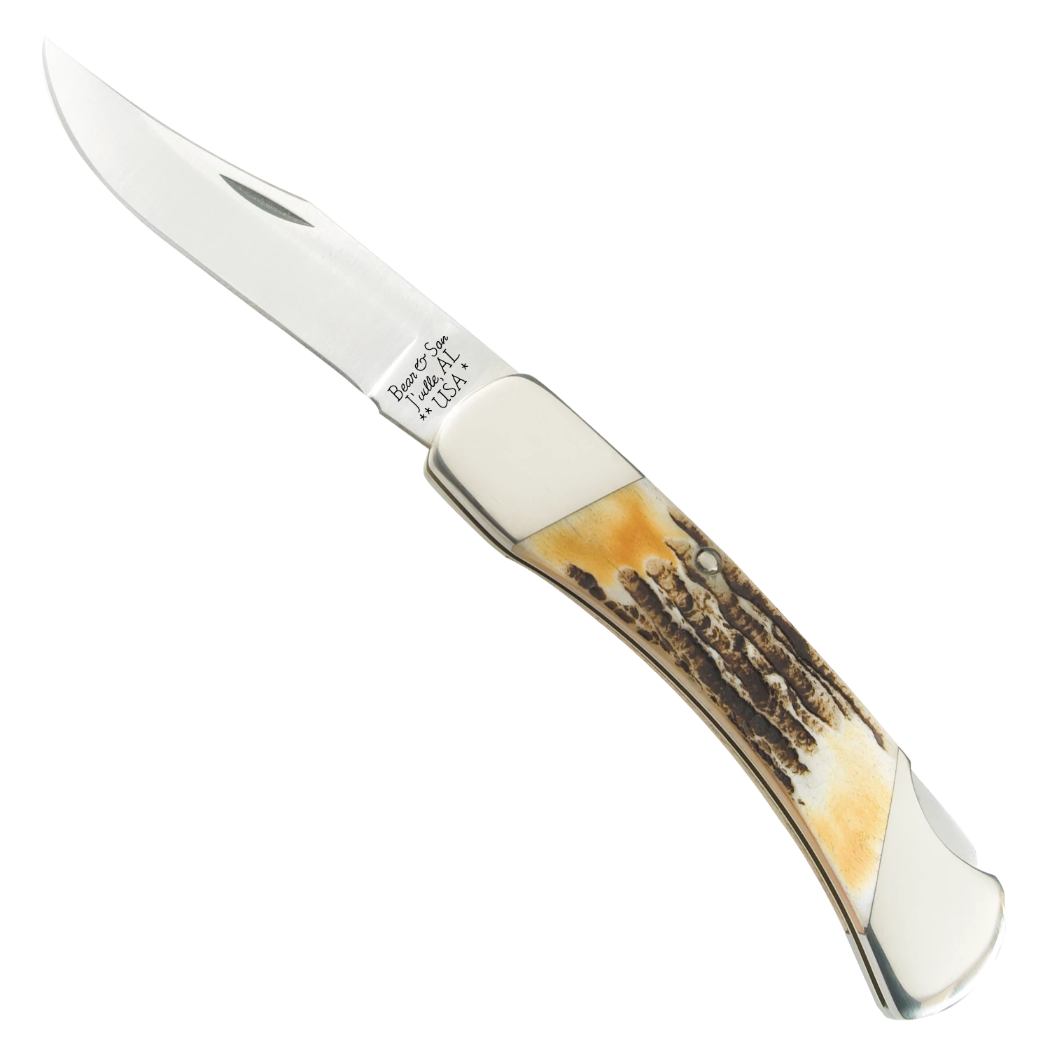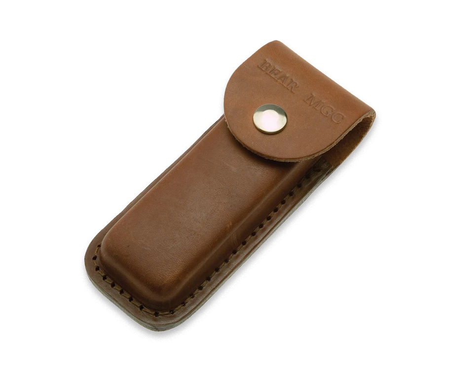 The Bear & Son 97 is a Professional Lockback comes with a Leather Belt Sheath. The Bear & Son 97 has a Hollow Ground 3-3/4″ Clip Point Blade that is made from High Carbon Stainless Steel, making it rust resistant, easy to sharpen, and will hold an edge exceptionally well. The 97 is designed with a Stainless Steel Liner and Nickel Silver Bolsters. The Bear & Son 97 features a positive lock to ensure that the blade remains firmly in place and a nail nick is present to open the blade. The Bear & Son 97 has an overall length of 8-3/4″ and comes with a leather sheath for belt carry. 97 weighs 5.5 ounces.